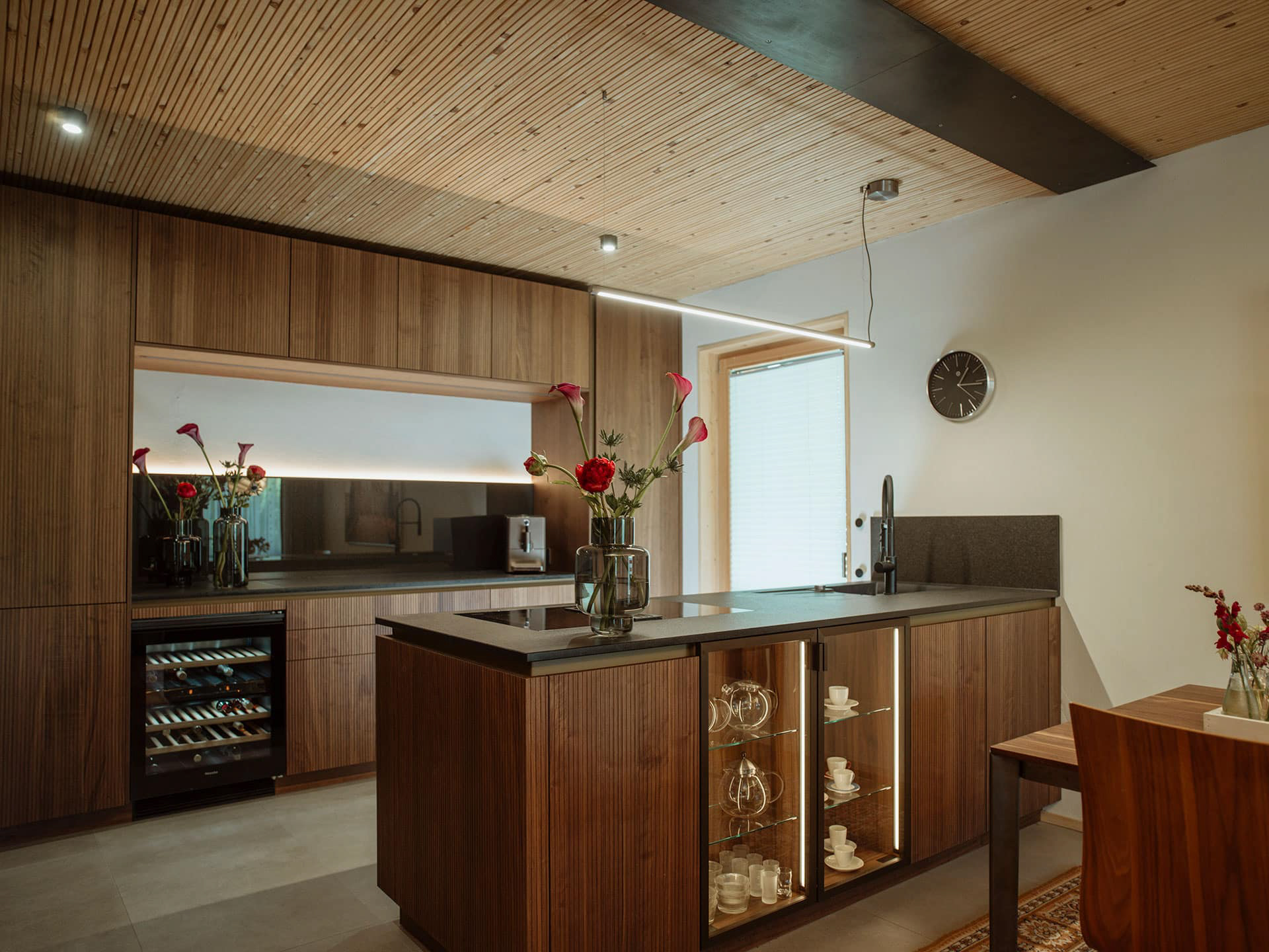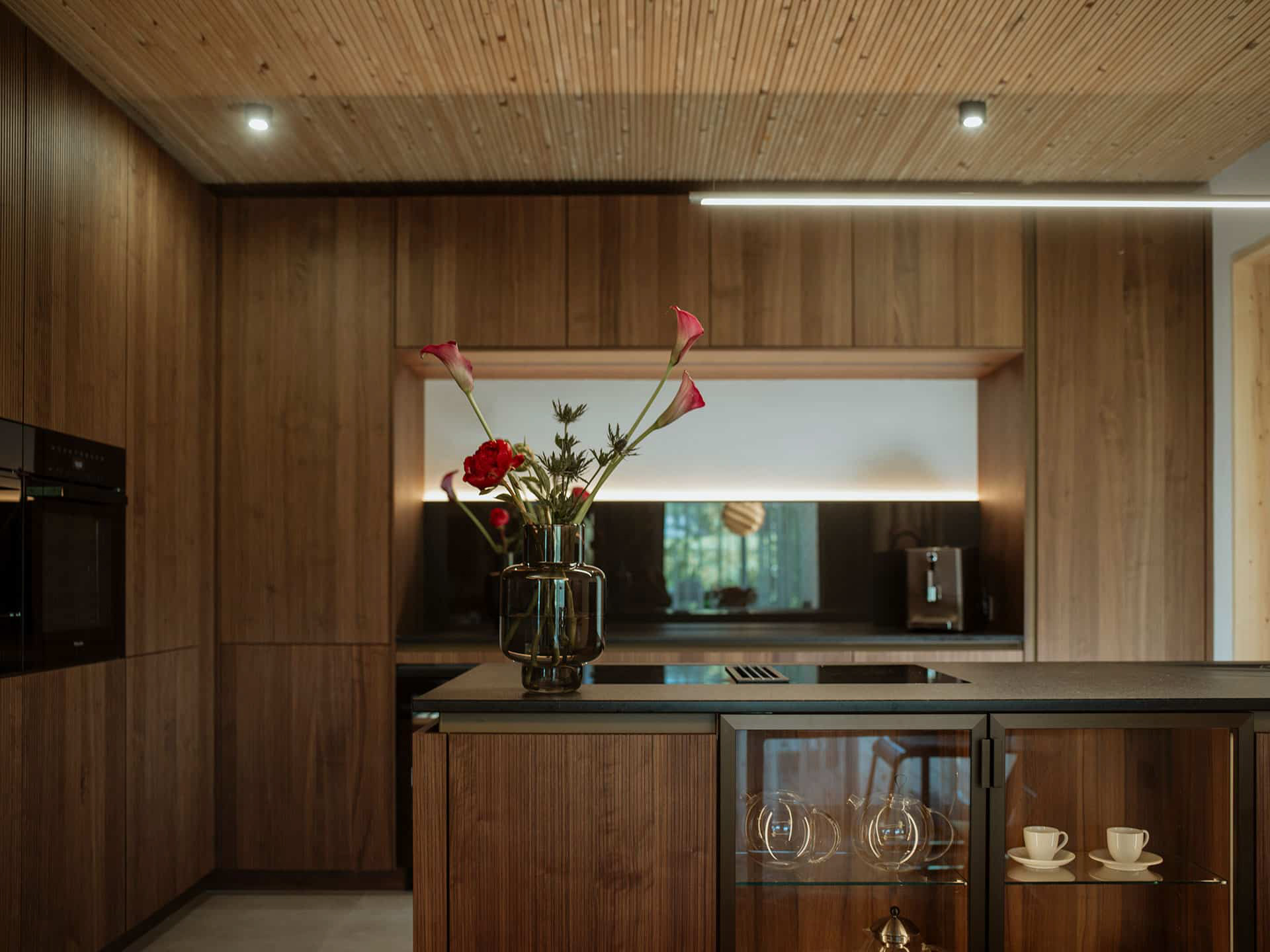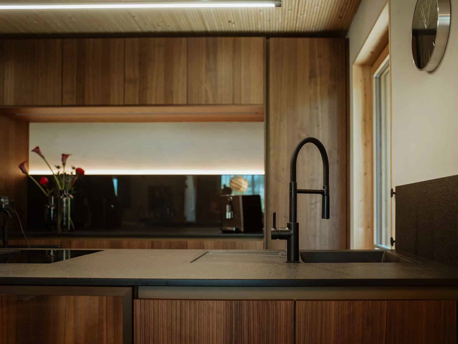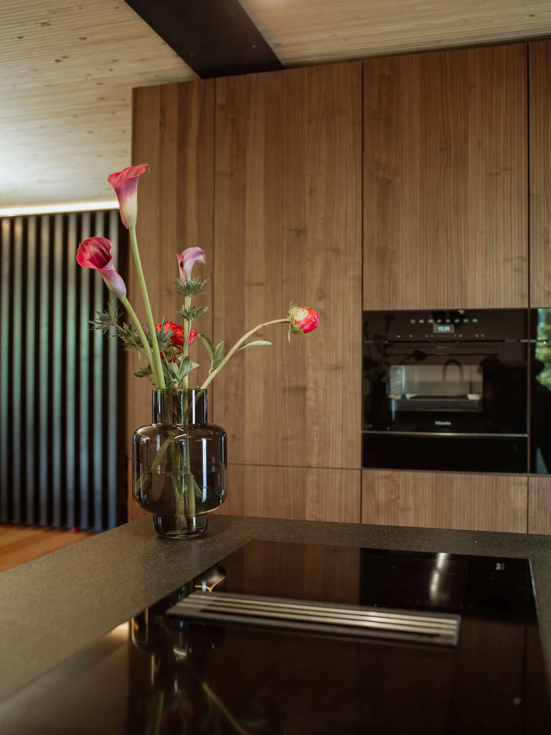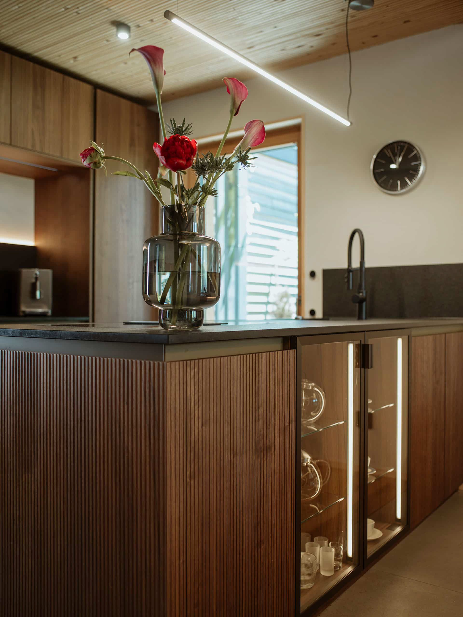 100% Bossa ZURÜCK ZUR ÜBERSICHT100% Bossa, 100% Eleganz, 100% Gemütlichkeit.Signature / Leicht / Modell Bossa, Farbe Walnuss liniert / Arbeitsplatte Naturstein: Nero Assolutto ZURÜCK ZUR ÜBERSICHT